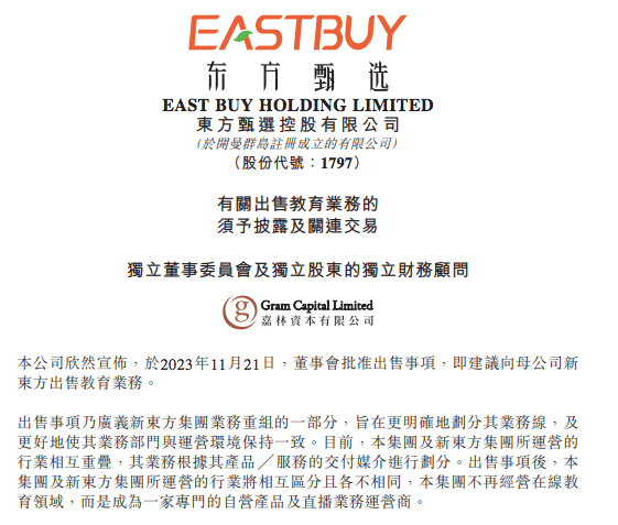 多知网11月21日消息,今日晚间,东方甄选发布公告表示,董事会批准出售事项,即建议向母公司新东方出售教育业务。出售事项是广义新东方集团业务重组的一部分,旨在更明确地划分其业务线,及更好地使其业务部门与运营环境保持一致。